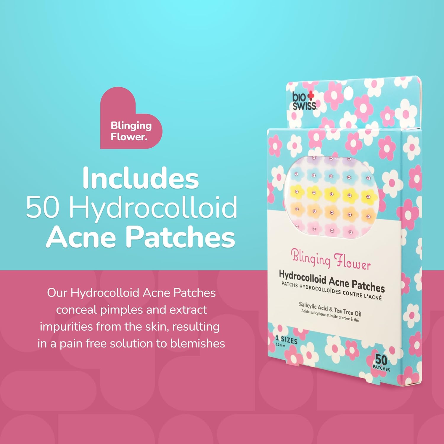 BioSwiss Pimple Patches, Blinging Flowers Patch for Zits and Blemishes, Hydrocolloid Spot Stickers for Face and Skin, 50 Count