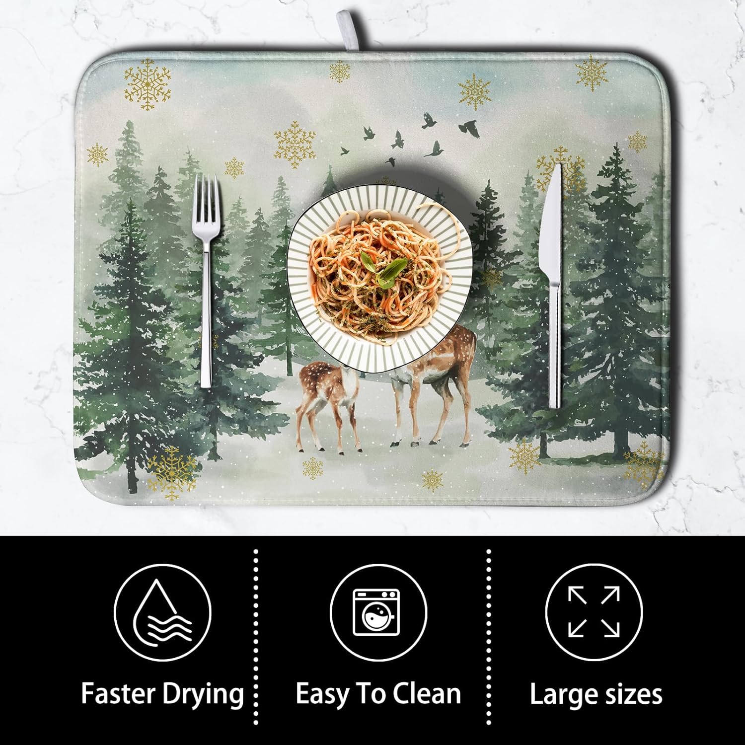 Reindeer Tree Snowflakes Christmas Dish Drying Mats for Kitchen Counter 16x18 Inch Winter Forest Dish Drainer Mats Absorbent Reversible Dish Draining Microfiber Dishes Drying Pad