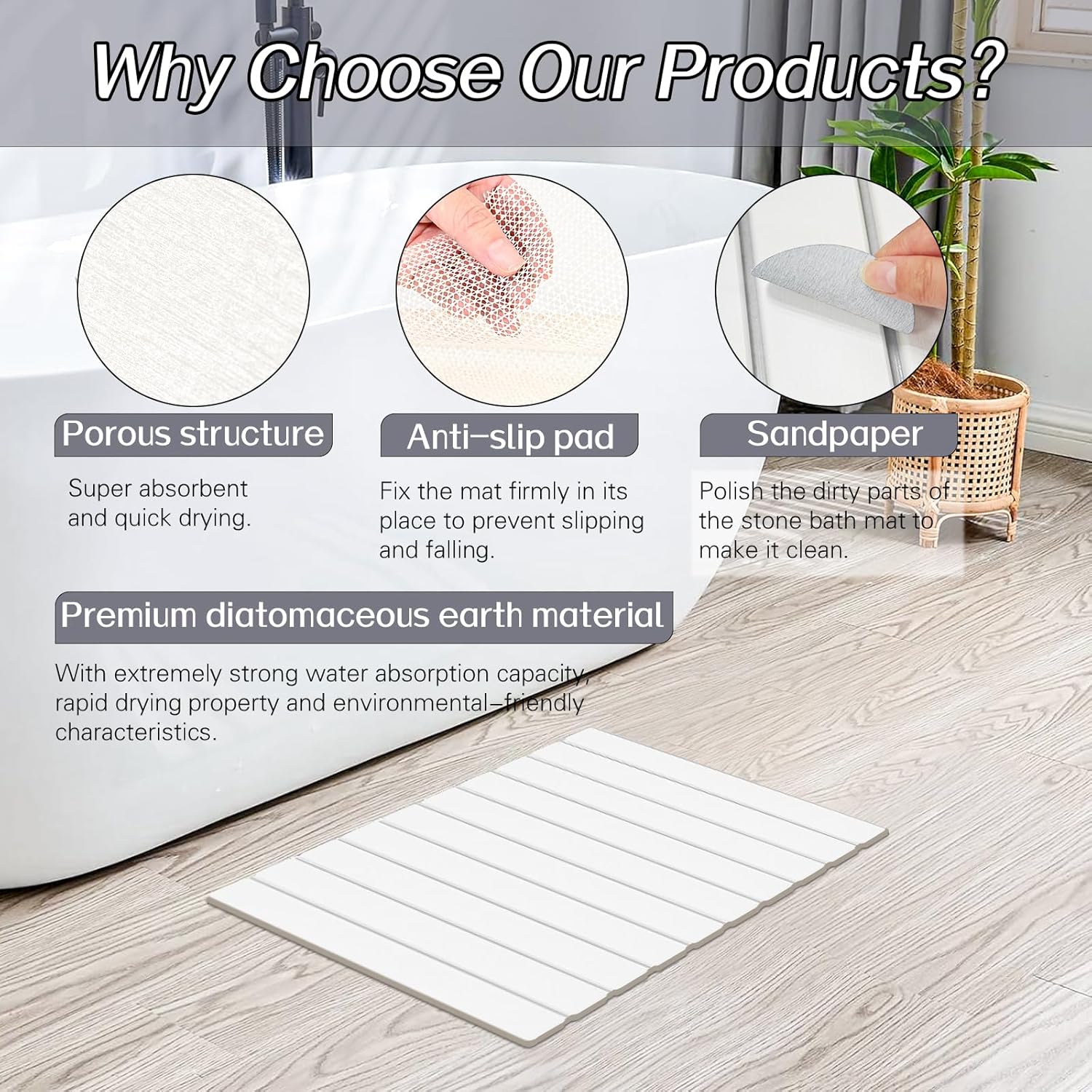 - Premium Diatomaceous Earth Material: Made from natural diatomaceous earth, these bath mats offer exceptional absorbency, rapid drying, and environmentally sustainable performance. The stone-like surface provides a refreshing tactile experience while effectively maintaining dry and clean floors