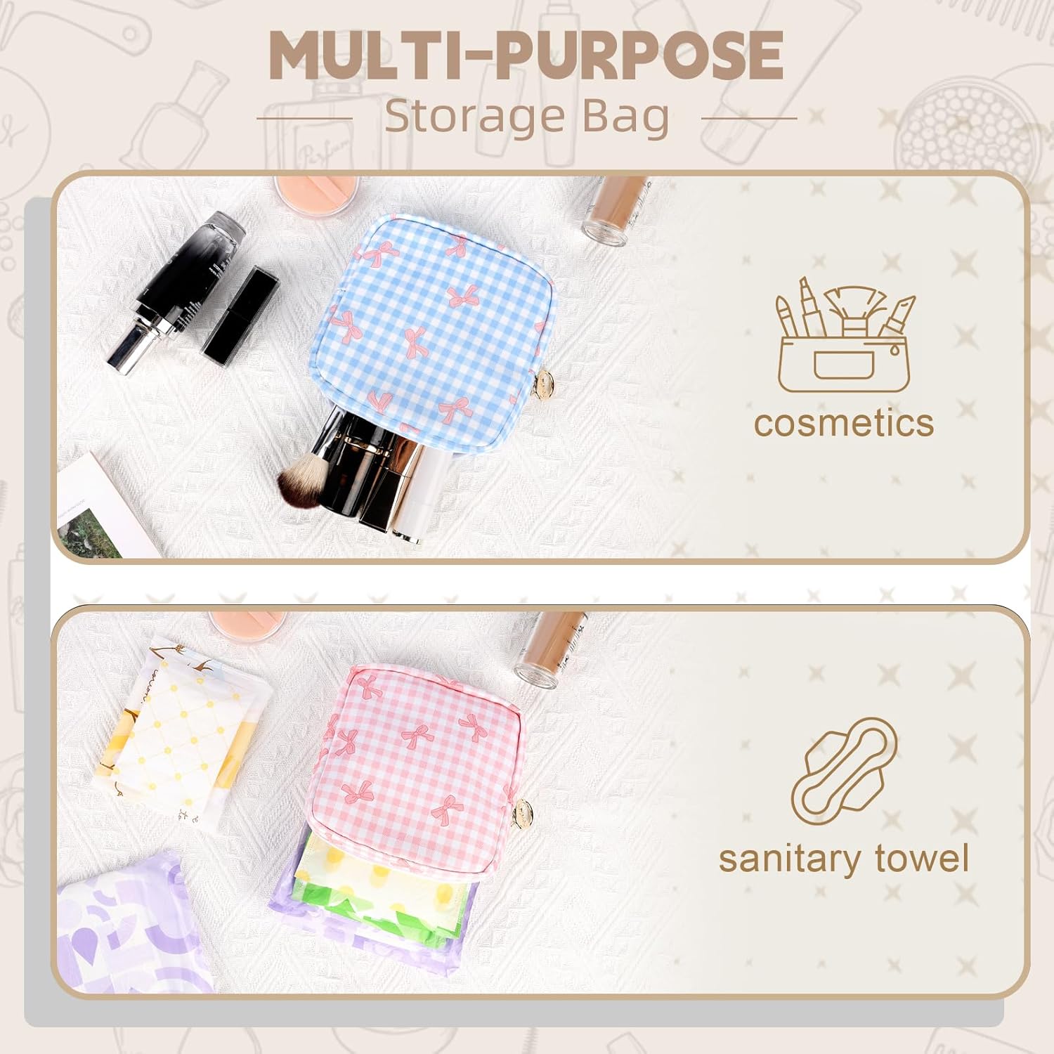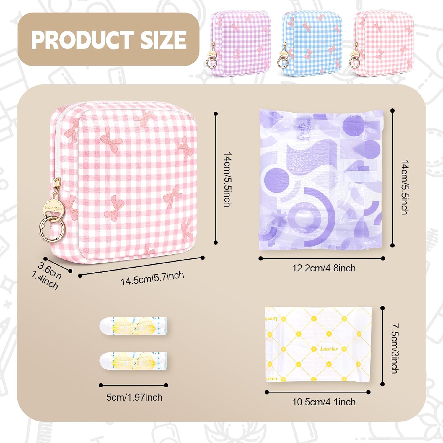 • 【Perfect Storage Pouch】Measuring: 5.6*5.5*1.7 inches. Bow tie sanitary napkin pouch can holds up to 10 normal size sanitary napkins and 4 tampons simultaneously. Whether you are at office, outdoors or traveling, the sanitary pad pouch can easily fit in your bag