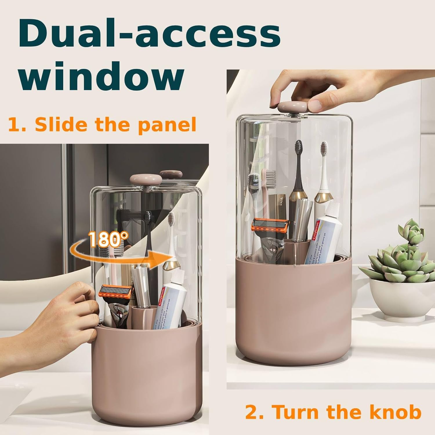 - 360° Rotating Inside Portion: Electric toothbrush holder has covered top that is clear with a large access window, turn the inner compartment to access the items you need