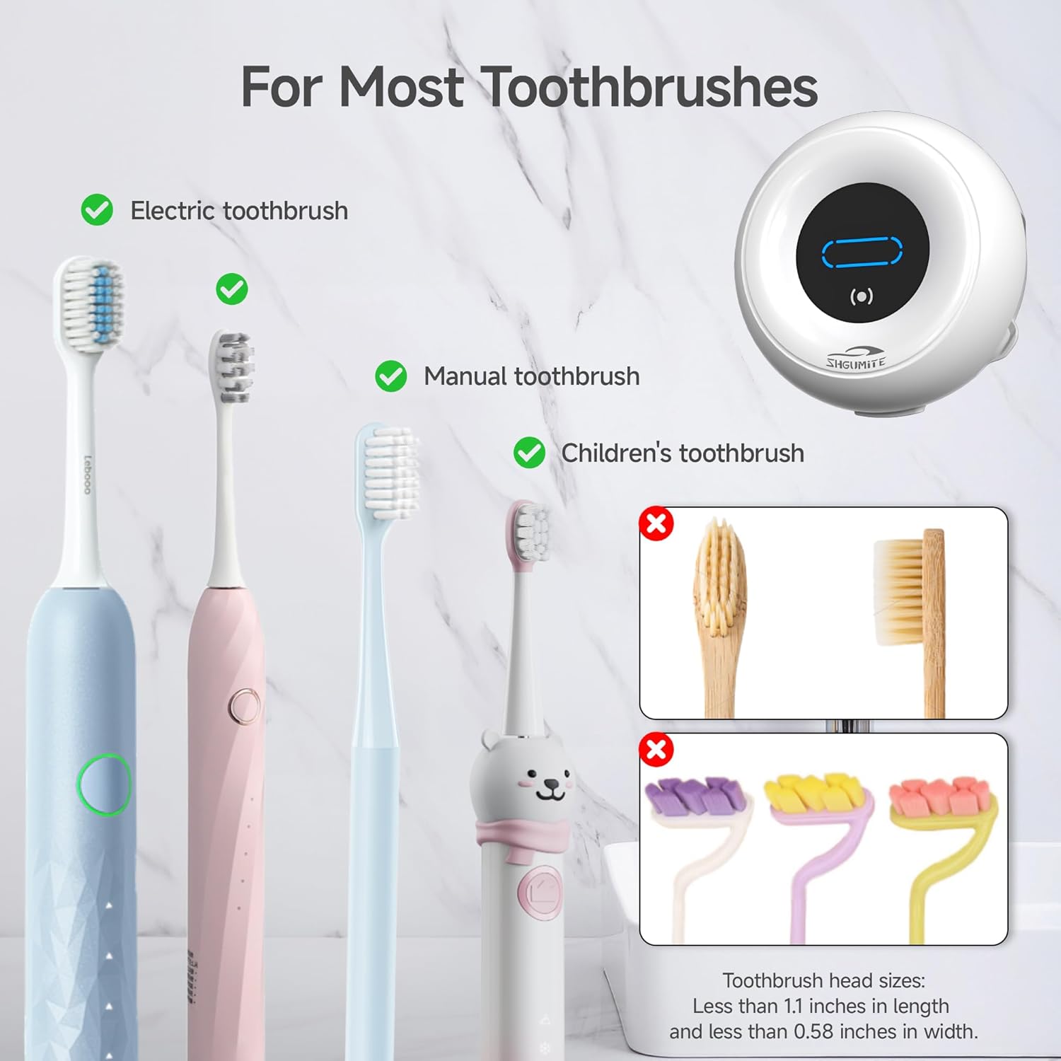 - For Most Toothbrushes: Toothbrush sanitizer and holder features two separate slots to accommodate a variety of toothbrushes, including manual, sonic, rotary, and slim-handled toothbrushes. This makes it an essential and versatile accessory for maintaining optimal hygiene at home