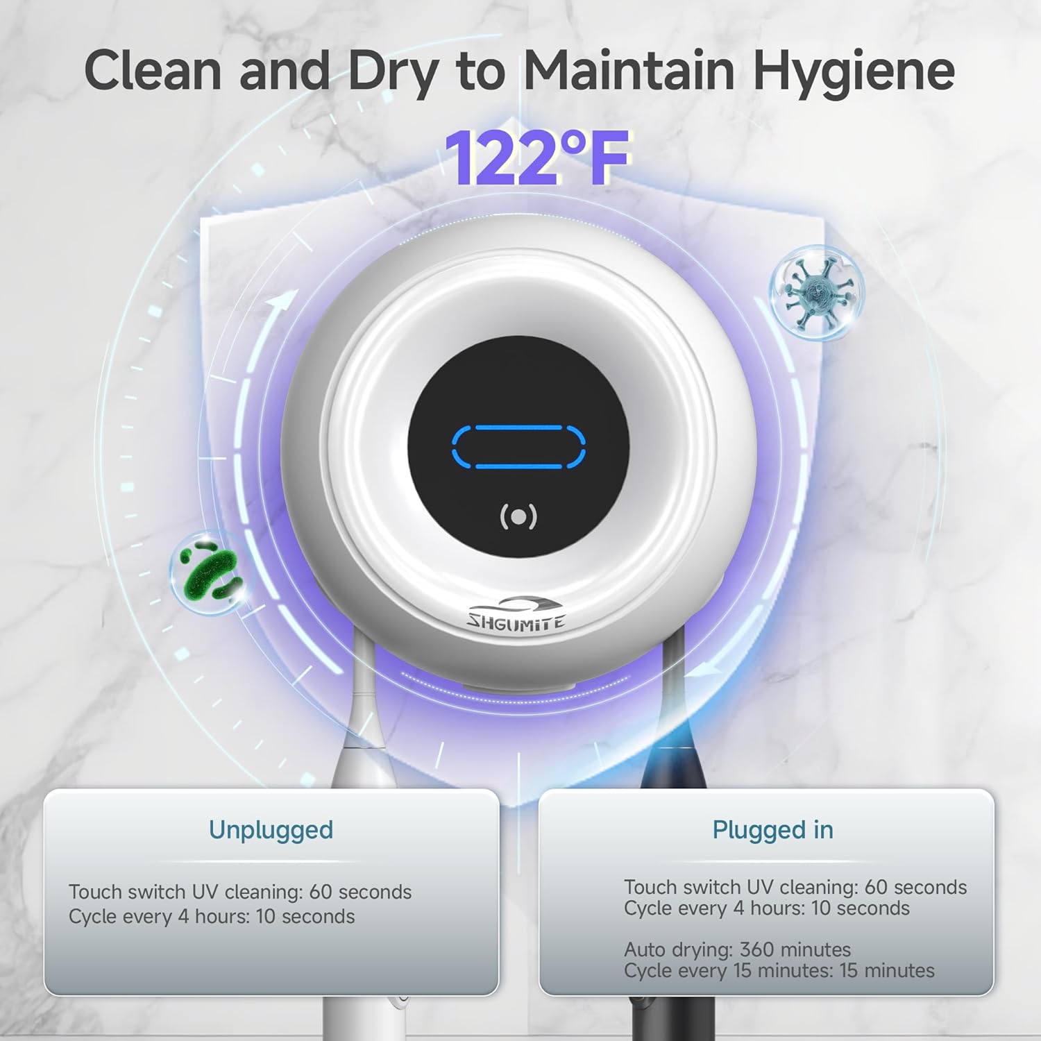 - Improved Oral Care: Press and hold the toothbrush holder for 3 seconds to enter a cycle of cleaning, killing 99.9% of dirt. Once connected to the power supply, it automatically switches to a constant temperature of 50°C for drying, ensuring your toothbrush is completely dry and hygienic after each use