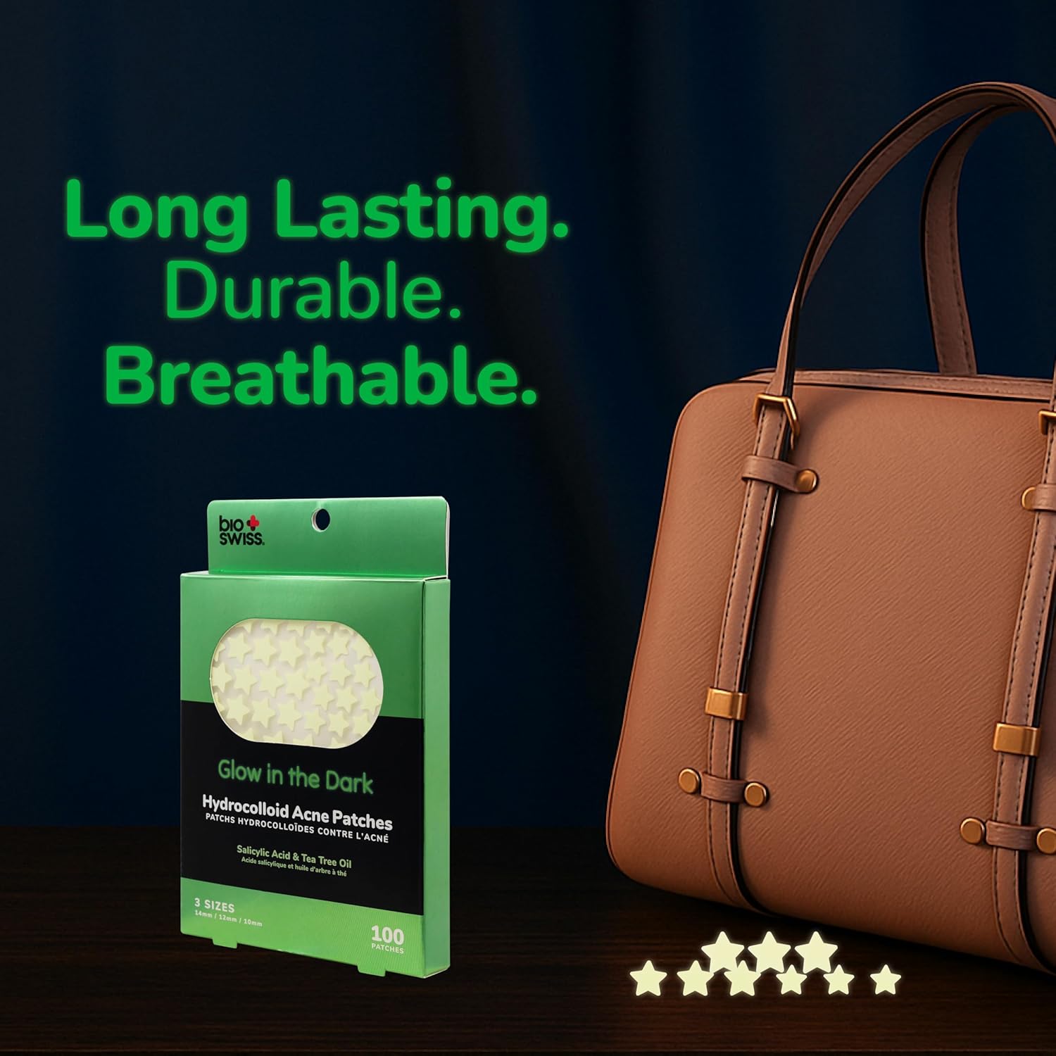BioSwiss Pimple Patches, Glow in the Dark Patch for Zits and Blemishes, Hydrocolloid Spot Stickers for Face and Skin, 100 Count