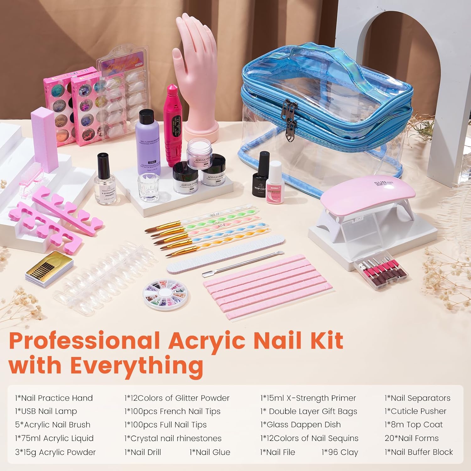 - [Acrylic Nail Kit for Beginners with Everything] - Wilfniee Nail Kit provides flexible nail hand, 3 colours of acrylic powder, EMA acrylic liquid, acrylic nail art brush (4#, 6#, 8#, 10#, 12#), nail drill set, 24 colours of decorative sequin glitter and storage gift bag to help you easily create your ideal acrylic nails. Various nail diy accessories allow you to have salon quality nails at home