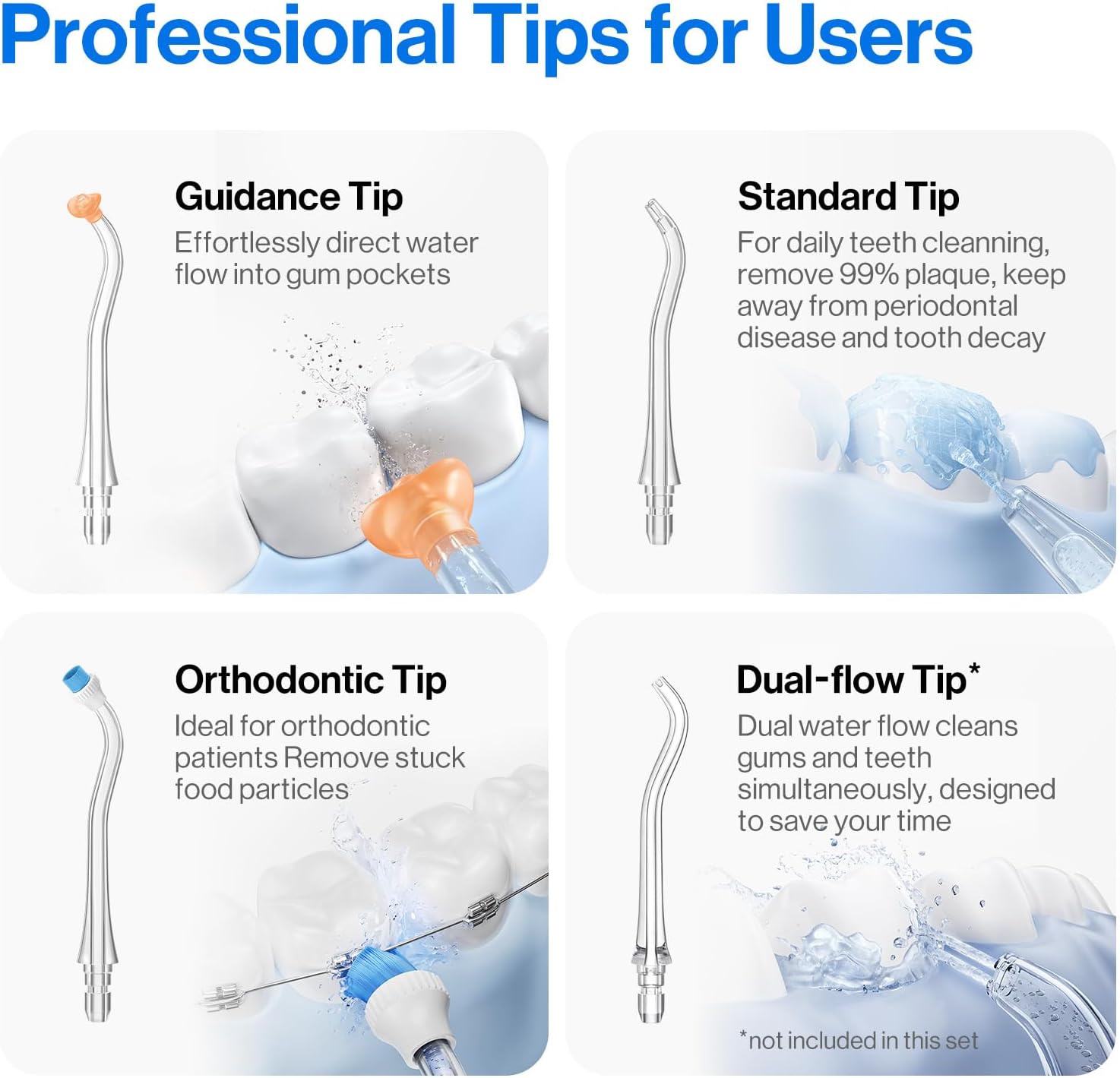 - ✅ Tip: Open the tank lid for faster refills—no need to use the side port. You can store the nozzles inside the flosser or in the dedicated nozzle case. Designed thoughtfully, just for you.