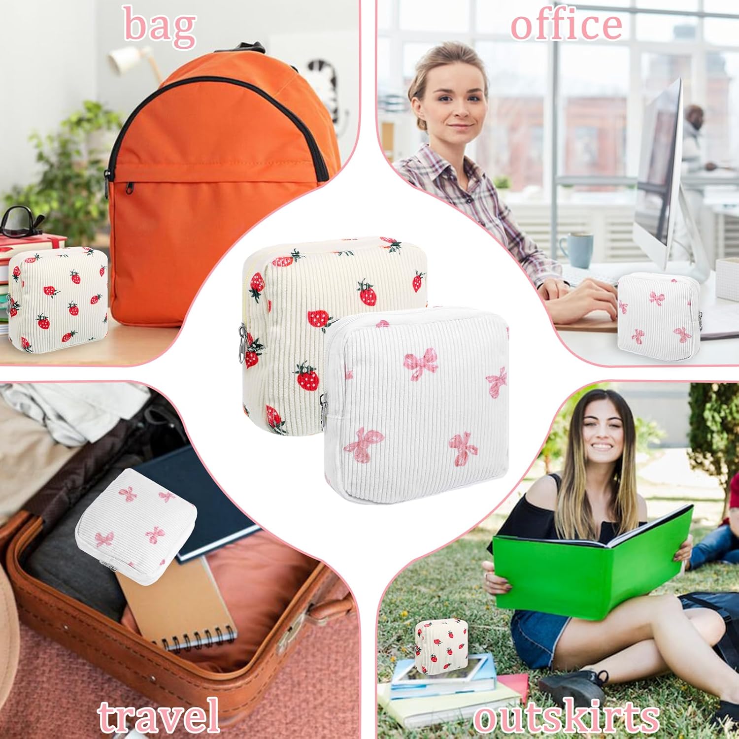 - [Secure] Period bag for school is easy to carry and offers enhanced privacy. Printed with a bow and strawberry pattern, the soft interior eliminates rustling sounds. Separate compartments provide secure storage, preventing awkward moments. It fits discreetly and securely in any bag