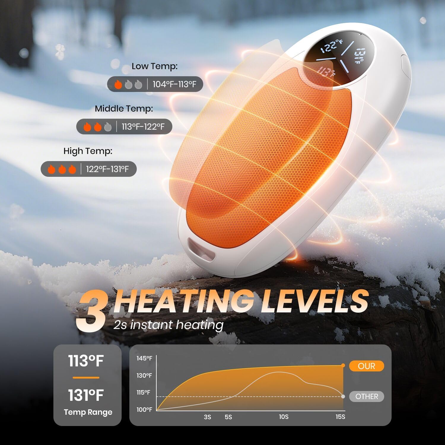 - 【6000mAh Battery – All-Day Heating on a Single Charge】: Powered by a high-capacity 6000mAh battery, this hand warmer provides 8 to 24 hours of heat, depending on the selected setting. Comes with a Type-C fast charging port and 3-level LED indicators to keep you informed on power status—perfect for worry-free winter outings.