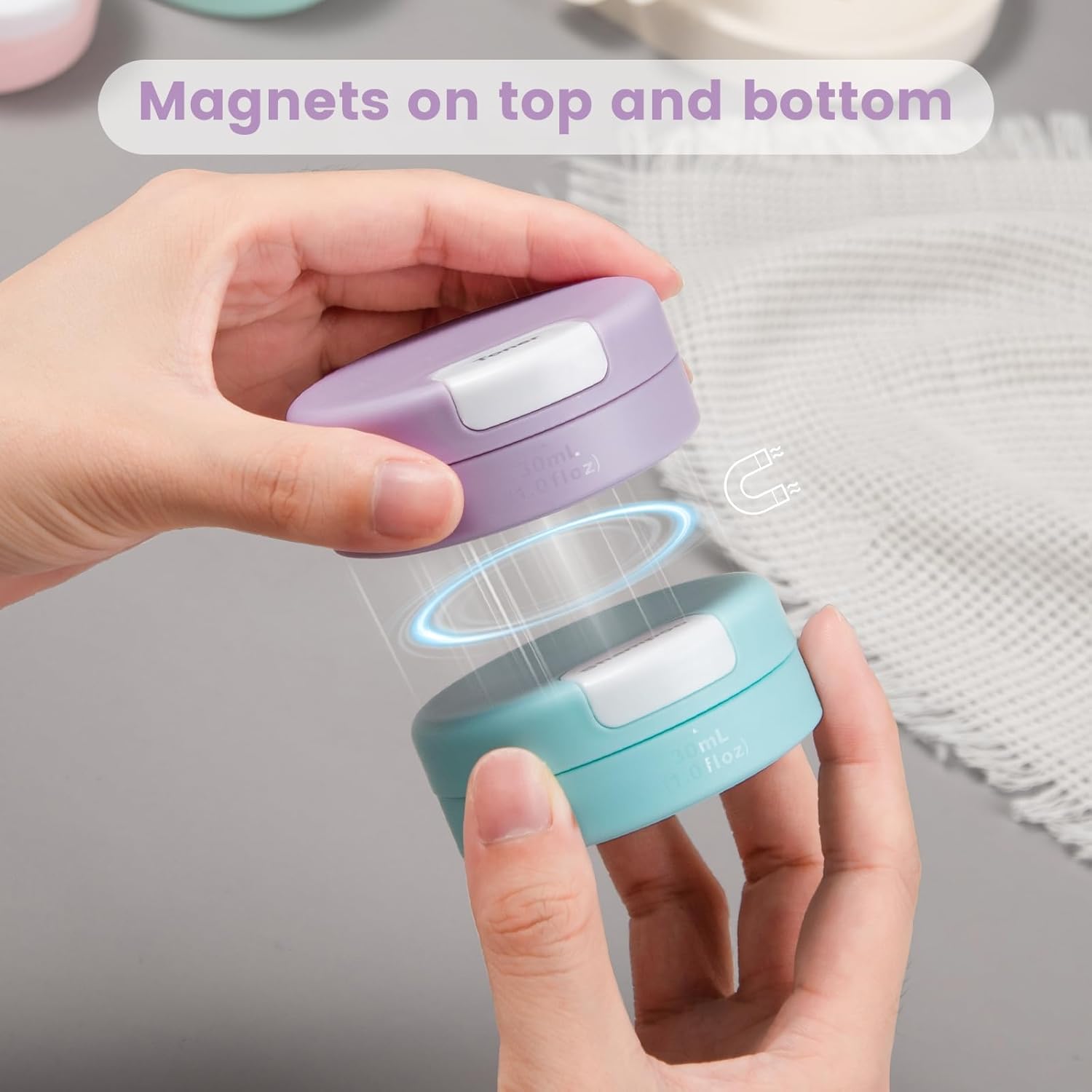 Gemice Travel Containers for Toiletries, Magnetic Travel Containers, TSA Approved Cream Jars with Toiletry Bag, Leak-proof Small 1oz Capsules Set with Multiple Labels for Organization (4 Pack)