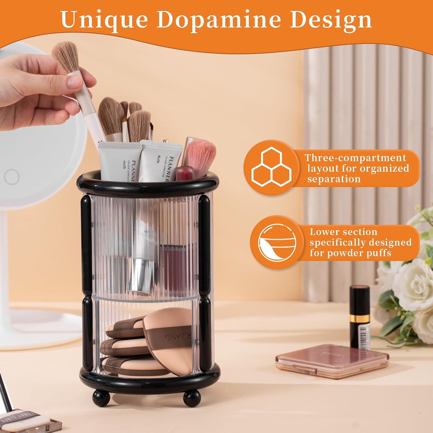 - Independent Storage: This organizer features a two-tier design for easy categorization. The upper tier has three compartments for neatly storing makeup brushes, mascara, eyeliner, lipstick, and similar items. The lower tier accommodates makeup sponges, jewelry, and other accessories.
