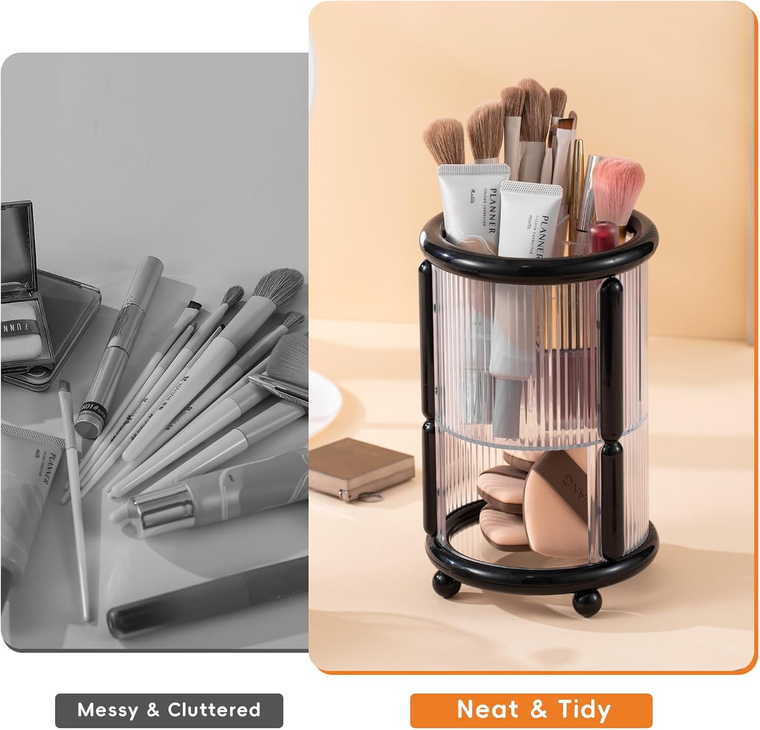 Makeup Brush Holder, 2 Tier Clear Cosmetic Tools Organizer, Round Makeup Organizer for Vanity Countertop (Black)