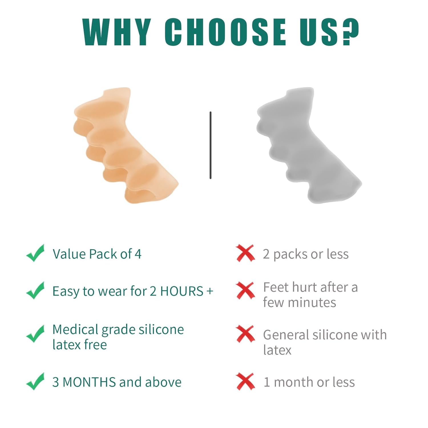 4 Pcs Silicone Toe Spacers – Yoga Toe Separators for Toe Straightening & Relaxation | Correct Overlapping Toes, Bunions, Hammer Toe | Toe Support toe separators for Women & Men (Tan, 3.98)