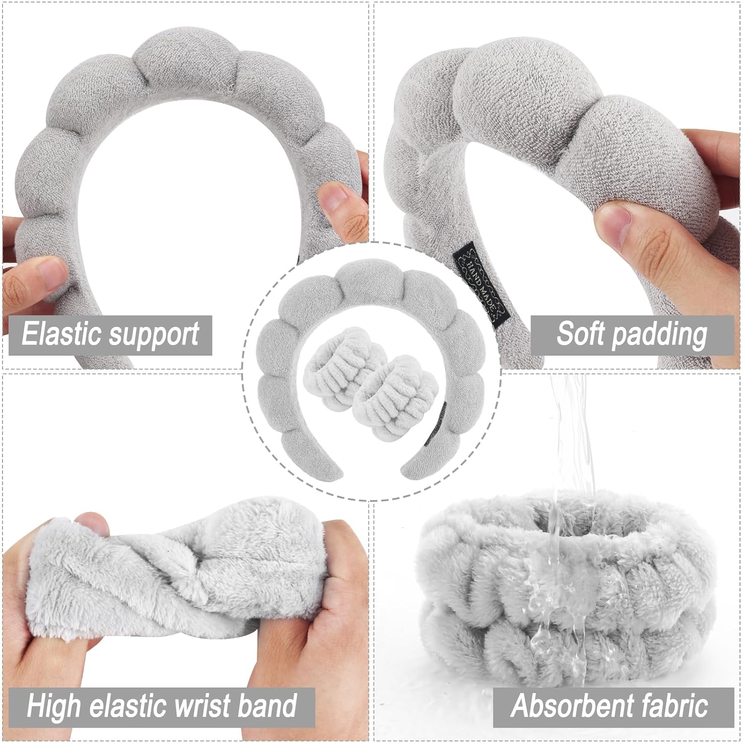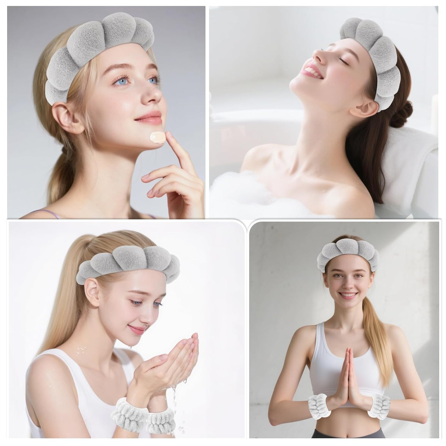Zkptops Spa Headband for Washing Face Wristband Set Sponge Makeup Skincare Terry Cloth Bubble Soft Get Ready Hairband for Women Girl Puffy Padded Headwear Non Slip Thick Hair Accessory(Grey-2)