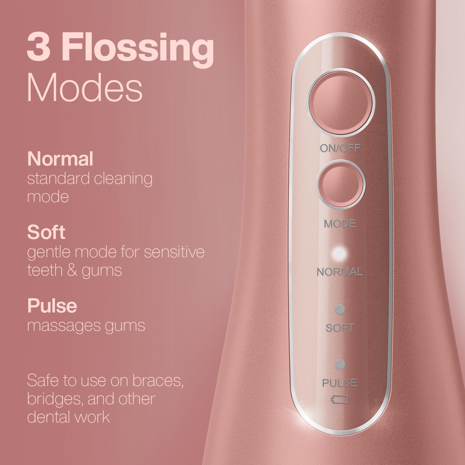 - 3 FLOSSING MODES & 6 TIPS INCLUDED – You can choose from Normal, Soft, or Pulse modes to customize your flossing experience to your comfort level. Six interchangeable, 360° rotating tips, including orthodontic and periodontal options, ensure thorough cleaning around braces, implants, dental work, and other hard-to-reach areas, providing complete oral care and better gum health.