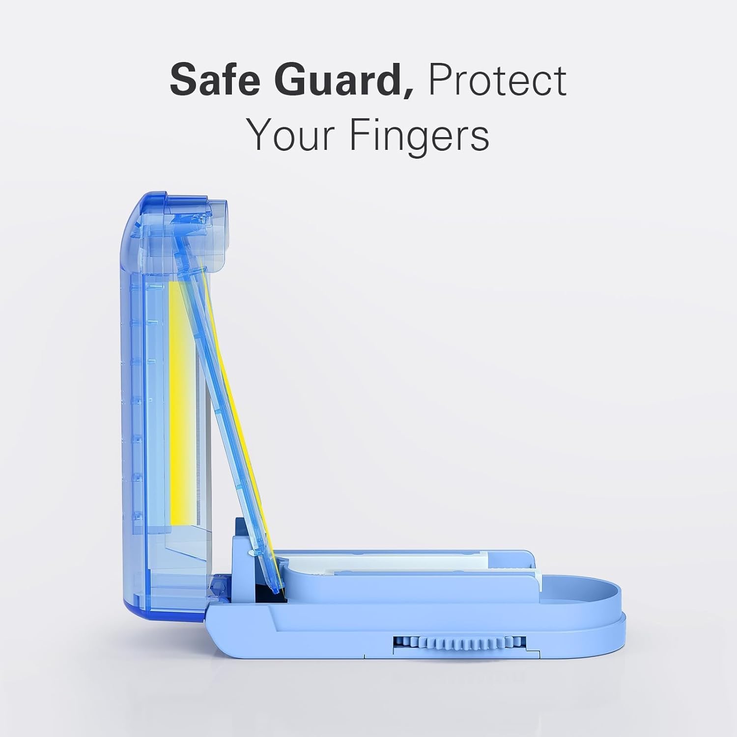 - 【Cut Evenly and Cleanly】: The sharp and sturdy thicker blade enables each pill to be cut evenly and cleanly. In addition, the pill cutter splitter for small and tiny pills is equipped with a retractable blade protection device to protect your fingers from being cut